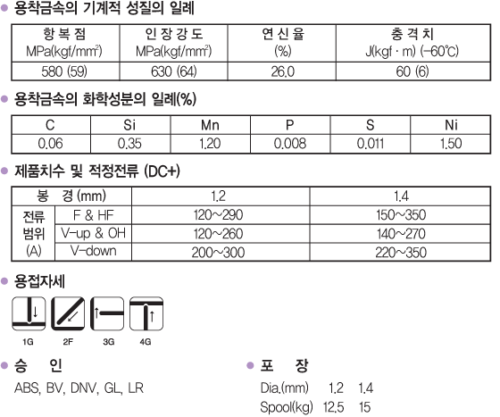 ② 저온 충격인성이 우수하며, 자동 및 반자동 용접에 적용 가능합니다.